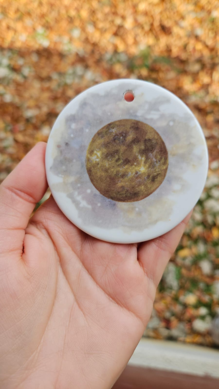 Tehnică: Pictat manual, apoi digitalizat și transferat pe porțelan, iar pe verso este o descriere scrisă de mână, inspirată de energia fiecărei planete.
