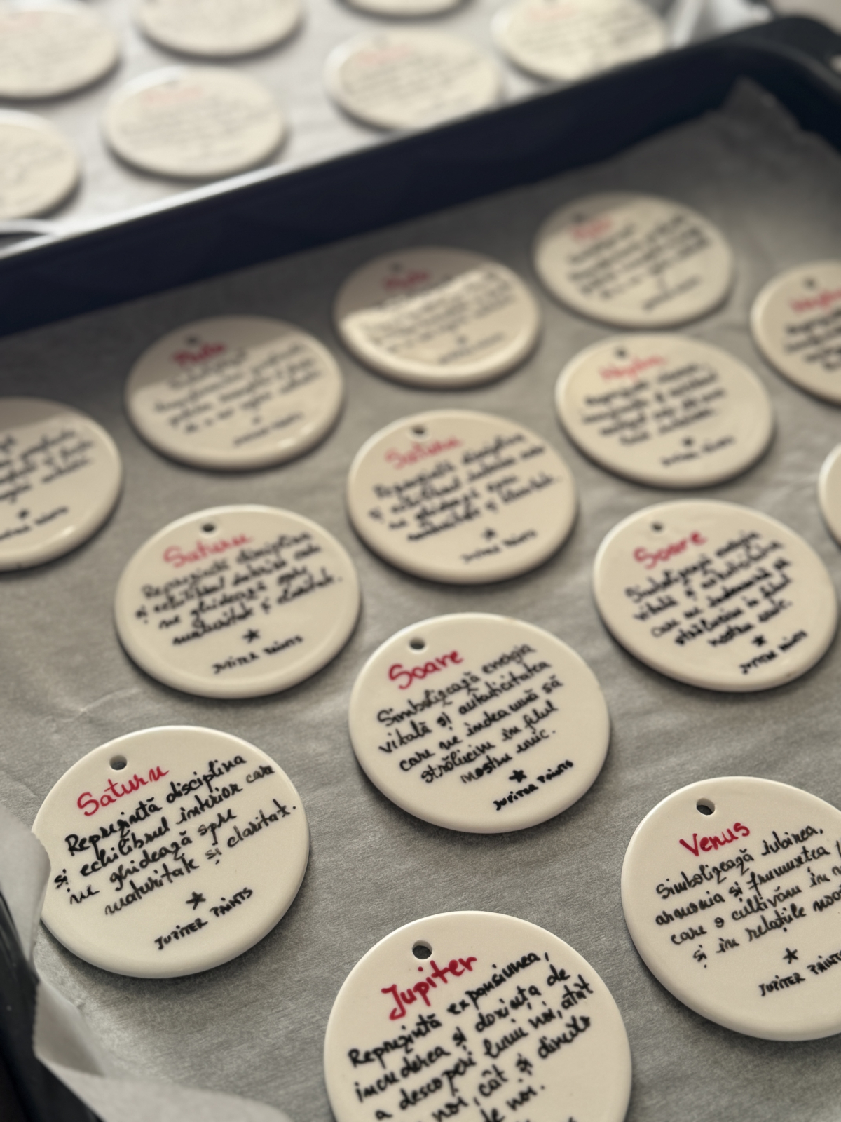 pe spate, scriu de mână o scurtă descriere, inspirată de energia pe care o asociem fiecărui astru. Folosesc un marker special pentru porțelan, iar la final ornamentele sunt arse la 150°C, astfel încât textul să fie perfect sigilat și rezistent în timp.